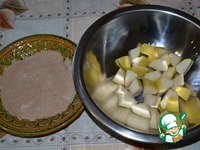 Каждый шарик теста примять рукой, положить кубик груши, защипать и снова придать форму шарика. |