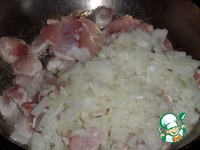 В разогретую сковороду наливаем растительное масло. Выкладываем лук и мясо. |