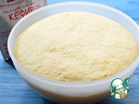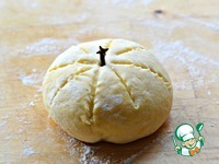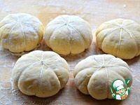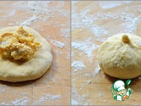 Раскатать заготовку в лепешку диаметром 9-10 см. В центр лепешки выложить 1,5-2 ч. ложки начинки, слепить тщательно края, сформировать круглую булочку. |