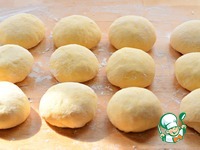 Выложить подошедшее тесто на рабочую поверхность, присыпанную мукой. Обмять, разделить на 12 равных частей. (примерно по 70 г) Из каждой сформировать шар. |