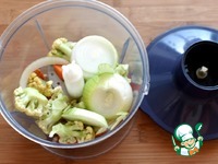 Пробейте блендером в крошку цветную капусту, репчатый лук и морковь. Обычно я беру по штучке овощей и примерно такое же количество цветной капусты. |