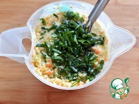 Выложите овощи в тесто, добавьте тонко нашинкованный зеленый лук. Добавьте соду и лимонный сок, перемешайте и влейте масло. |