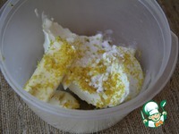 За время выпекания приготовить кремовое покрытие. Взбить сливочный сыр с размягченным сливочным маслом (60г). Добавить сахарную пудру, цедру и лимонный сок-1,5 ч. л.. |