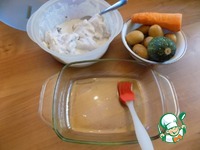 Описание: Курица, замаринованная на домашнем кефире с применением закваски Oursson, с добавлением лука, чеснока и хрена в сливках. Курицу запекла с овощами с использованием этого же маринада. Из овощей взяла мини-картофель. Самые маленькие клубни ~ 3-4 см в диаметре. Картофель не чистила, а просто хорошо помыла щёткой и выложила в форму. В таком картофеле больше калия, а как известно калий нужен сердцу. Проще говоря-это диетическое блюдо. Всё в нём полезно: и курица, и овощи и конечно же кефир.