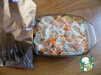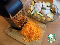 Выкладываем замаринованную курицу в форму. Заполняем свободные места мини-картофелем. Кабачок, порезанный полу-дольками тоже туда отправляем. Морковь натираем на тёрке. |