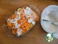 Сверху выкладываем морковь и заливаем всё кефирным маринадом вместе с чесноком и луком, равномерно распределяя его. |