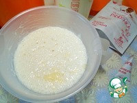 Сразу, в теплую еще ряженку, добавить дрожжи и сахар. Можно подогреть в микро немного, если остыла ниже комнатной температуры. Перемешать и отставить на 15 минут до образования пенной шапочки. |