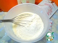 Добавить для начала третью часть муки и хорошо ее перемешать венчиком, чтобы не было комочков. |