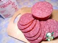 Колбасу берем любую - хоть варенку, хоть подкопченную, диаметром 7-9 см. Нарезать ее пластиками 0,5 см |
