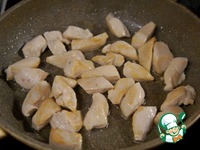 Куриное филе нарезать небольшими брусочками и обжарить до легкого румянца. |