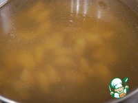 В кипящий бульон добавить картофель и зажарку, довести до кипения и варить на слабом огне 5 минут. |