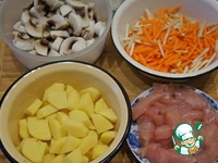Морковь и сельдерей нарезать соломкой, картофель и шампиньоны – небольшими ломтиками. |