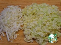 Тем временем нижнюю часть листьев капусты тонко нашинковать, верхнюю, нежную часть нарезать широкой лапшой. |