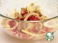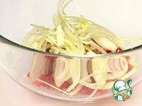 Репчатый лук нарезать полукольцами, добавить к другим ингредиентам |