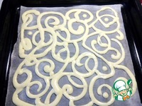 Выложить тесто в кулинарный мешок с круглой насадкой и отсадить на противень с промасленным пергаментом любой узор. Отставить на время в сторону. |