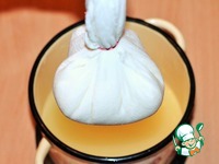 6. Приготовим дуршлаг и марлю. Сложить марлю в 2-3 слоя. Выстелить дуршлаг марлей и осторожно вылить содержимое кастрюли. Дать время сыворотке стечь. |