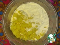 В кефир добавить соду, перемешать. В муку добавить сливочное масло и кефир. Замешать мягкое однородное тесто. |