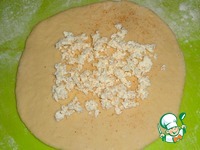 Тесто делим на равные части, получается примерно 5-6 штук. Раскатываем в лепешку. По центру раскладываем творог и посыпаем приправой. Можно добавить зелень. |