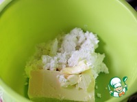 В миску выложить размягченное сливочное масло и творог. Чем нежнее и мягче творог, тем мягче будет печенье. |