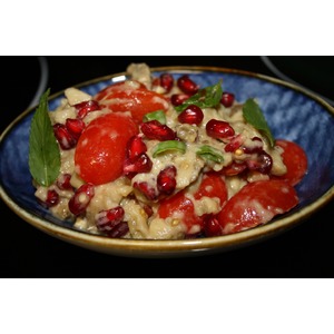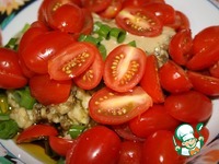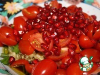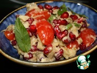 Описание: Предлагаю попробовать вкусную закуску- мезе из печеного баклажана в тандеме со сладкими и сочными помидорками черри и сочными зернышками граната.