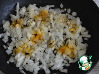 Лук и чеснок нарезать. В чугунную сковороду выложить лук и чеснок. Сверху приправить куркумой и черным перцем. |