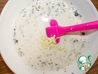 Для заливки смешиваем ряженку, тмин, мускатный орех, орегано, душистый перец и чеснок. |