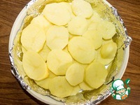 Выкладываем на фольгу равномерно кружки картофеля. |