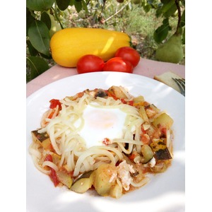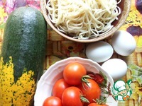 Итак, у меня уже отваренная лапша, яйца, помидоры и я взяла половину кабачка, что на фото. |