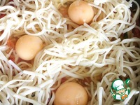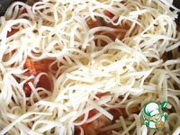 Уменьшить огонь до минимума и сверху выложить лапшу, формируя гнездышки. |