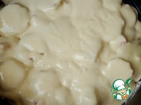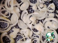 Форму смазать маслом сливочным (можно не смазывать, если покрытие не повреждено), выложить на дно лук, нарезанный кольцами. |
