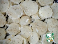 Сверху лука уложить остывший картофель, нарезанный тонкими кружками, посыпать специями. |
