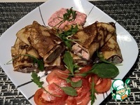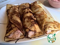 Выкладываем начинку на блинчики и сворачиваем трубочками. |