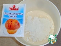 Наливаем в тесто растительное масло, его можно заменить растопленным сливочным маслом. Насыпаем разрыхлитель теста и муку, перемешиваем. |