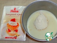 Готовим ароматный заварной крем. В 100 мл молока разводим сухую смесь заварного крема. Оставшиеся 200 мл подогреваем, выливаем в общую смесь. |