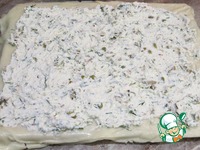 Промазываем сырный лист творогом... Оставляем на краях по 1,5-2 см. Это позволит рулету хорошо склеиться. |