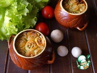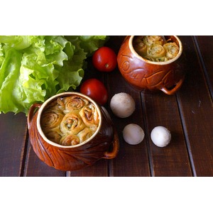 Описание: Предлагаю попробовать вкусное блюдо, которое готовится в горшочках. Изюминкой блюда станут рулетики из теста с чесночной намазкой.
