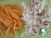 Морковь и лук очистить. Морковь нарезать тонкой соломкой или кубиком. Лук измельчить. Шампиньоны нарезать тонкими пластинками. |