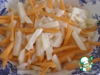 Картофель вымыть, очистить и нарезать. В чаше перемешать морковь, лук, картофель, шампиньоны, немного посолить, добавить 1 ст. л. растительного масла. |