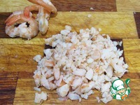 А теперь отвариваем и чистим креветки. Нужно оставить с хвостиком 6 штук (самых красивых) для украшения. Остальные мелко рубим. |