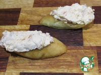 Поджариваем на сливочном масле кусочки багета. Намазывает толстым (не мене половины толщины багета) слоем творожно-креветочной массой. |