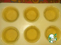 Тесто раскатать в пласт толщиной 2 мм. Вырезать круги по размеру больше чем размер формочек, в которых будут выпекаться тарталетки. |