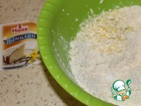 В миску всыпать муку и разрыхлитель, добавить масло натертое на крупной терке и ванилин. Перемешать. |