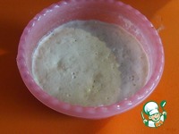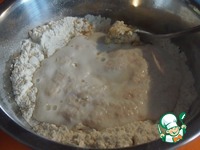 Тем временем дрожжи образовали пузырчатую шапочку, вылить их к муке. Перемешать. |