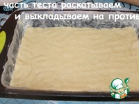 Одну часть теста раскатываем и выкладываем на противень. |