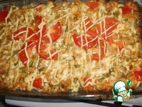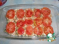 Морковь с репчатым луком обжариваем в сковороде с растительным маслом до золотистого цвета. Смешиваем все ингредиенты, кроме помидор и кабачков. |
