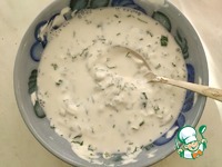 Сверху выложить котлетки. Подготовить соус:смешать сметану и зелень, добавить немного воды. |
