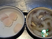 Берем креветки и морские гребешки. Если они замороженные - кладем их в холодную воду минут на 15 |