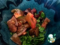 Описание: Это довольно простой салат, который обладает очень мягким и интересным вкусом. Рецепт этот взят из передачи непревзойденного Ильи Лазерсона - "Завтрак в постель". И действительно он отлично подходит для завтрака - легкий и вместе с тем сытный - за счет присутствия пармской ветчины. В классическом сочетании свеклы и брынзы, которая обладает довольно резким вкусом - брынза заменена творогом, который придает этому салату довольно нежный вкус и не перекрывает вкус прошутто. Сочетание сладковатого вкуса запеченной свеклы с творогом дополняется и подчеркивается кислинкой помидоров и горчинкой оливкового масла. По желанию можно усилить кислый вкус добавлением лимонного сока.
