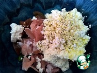 Добавляем творог, оливковое масло (Extra Virgin) и, по желанию, лимонный сок. Перчим, солим и перемешиваем. |