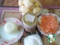 Вот наши продукты. Сразу скажу, что тушенка у меня своя. А морковь натертая и замороженная в морозилке, т. к. подвал теплый и хранить негде. |